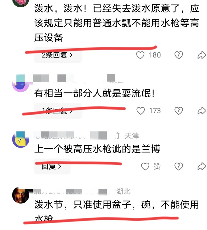 但更多人说,这是借着泼水的名义,形成某种“骚扰”,这事应该怎么去看呢?媒体报道是说,两位骑电动车穿着比较清凉的女子经过,被周围的人围准泼水,尽管已经表示了拒绝大家的泼水,但反而被泼的越来越离谱,加上衣着清凉打扮,场景看完以后,让人着想有点尴尬!